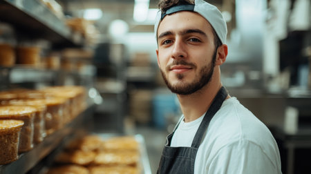 A young baker stands confidently in a vibrant kitchen surrounded by an array of freshly baked pastries and desserts. The lively atmosphere showcases his passion for baking as a variety of goods sit on shelves behind him reflecting the busy nature of a morning rush
