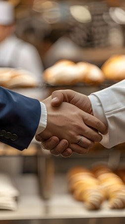 A handshake between two individuals in a bakery setting, symbolizing partnership or agreement.