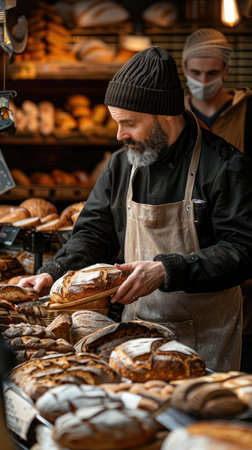 Baker presenting fresh bread in bakery shop.