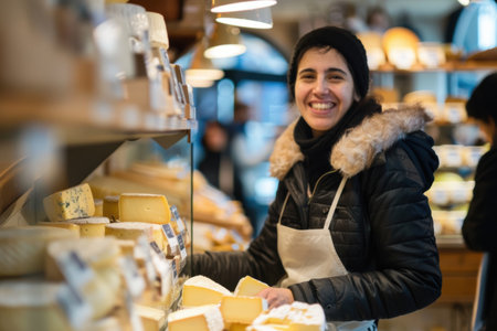 A young stylish vendor holding cheese in a European cheese market
