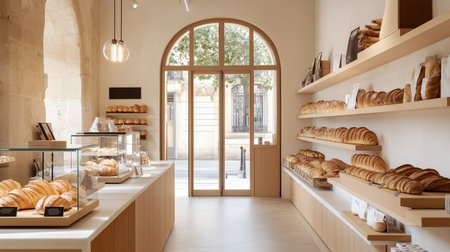A modern bakery interior featuring fresh breads and pastries with a natural light ambiance in the heart of a city