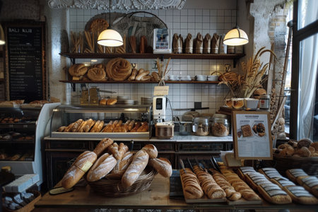 A cozy bakery filled with a variety of freshly baked breads and pastries. Ideal for themes of food, baking, and culinary arts.
