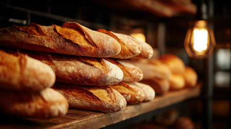 A captivating image showcasing freshly baked artisan bread stacked neatly on wooden shelves in a rustic bakery, illuminated by warm light, evoking comfort and culinary artistry.