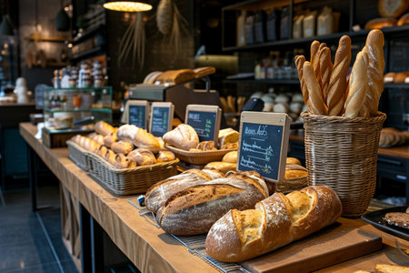 Artisan Bread and Pastries Display in Rustic Bakery Shop. High quality photo