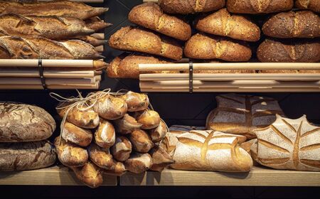 Loaves of bread on wooden shelves in baker shop, in Germany. Different types of bread. Tasty sourdough bread. Healthy eating. Bakery interior.