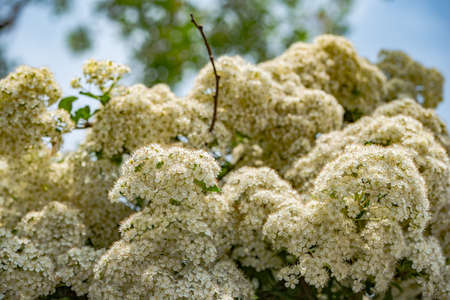 Beautiful blooming hawthorn tree in springtime. White flowers background