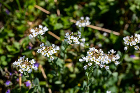 Natural evergreen candytuft flowers or blooming Iberis sempervirens close up with selective focus and bokeh