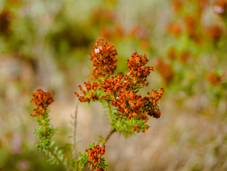native Australian pink crowea plant with flower and golden leaves in winter in Australia