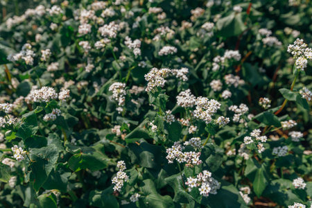 Buckwheat (Fagopyrum esculentum) flower in cultivated field, selective focus
