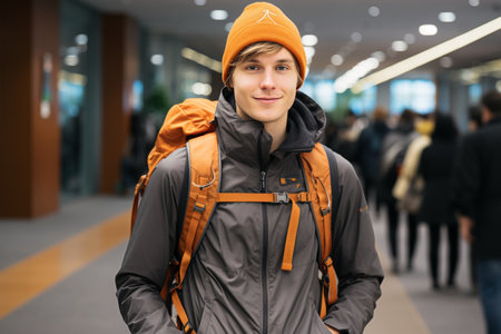 a young man with a backpack in airport, travel alone concept
