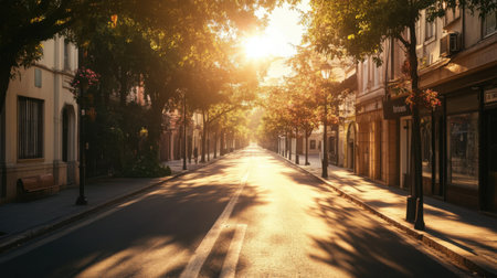 Serene tree-lined street in a bustling city during early morning light