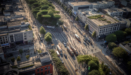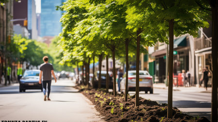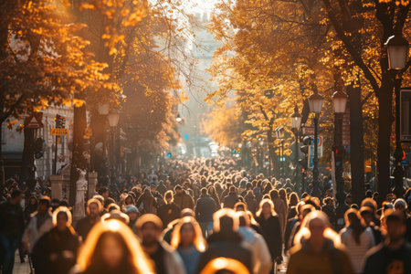 A bustling crowd moves through a tree-lined urban street, hinting at daily life and sustainable city living.. AI Generation