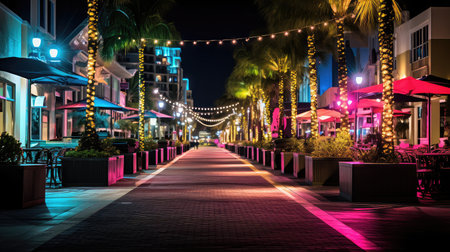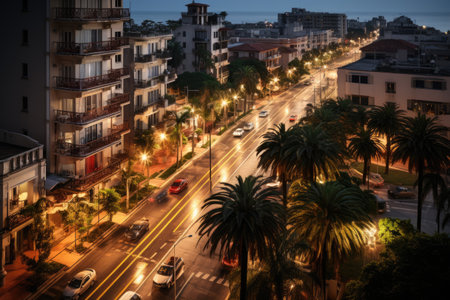 Nighttime cityscape featuring a luminous boulevard adorned with elegant palm trees