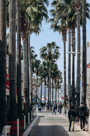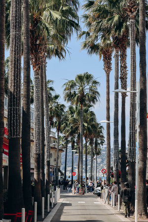 Juan-les-Pins, France - 20 May 2023: Street with palm trees in Juan les Pins, French Riviera
