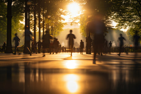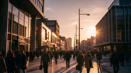 Business people in motion walking in busy street in large industrial city on sunny summer day.AI Generative.