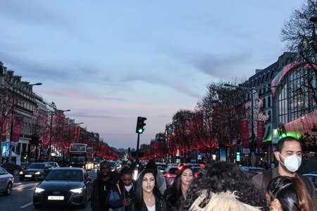 Paris, France - January 01, 2022: People going at Elysian Fields, Champs-Elesees in Paris. Paris - the capital of France. Main political, economic and cultural center of France.