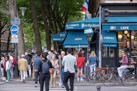 PARIS, FRANCE - JUNE 6, 2022: Tourists and Parisians enjoying a beautiful day on the streets of Paris after pandemic period.