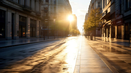 A serene urban street stretches into the distance, flanked by trees with autumn leaves. Morning light casts a warm glow on the empty roadway, creating a peaceful atmosphere.