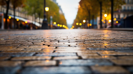 Cobblestone pavement in the city center at sunset. Shallow depth of field.