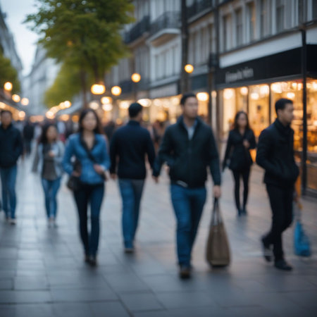 Natural bokeh of city cantre view, blurred out of focus background. Abstract beautiful backdrop for text or advertising. Unfocused cafes, buildings and people