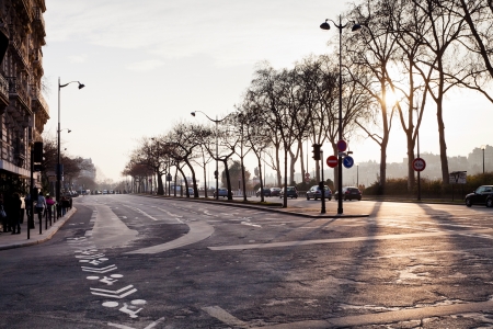 PARIS, FRANCE - JULY 19th, 2014. A view down Avenue de l'Opera busy with pedestrians and traffic on a summer day with high clouds. Cloudy weather
