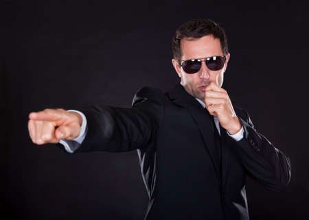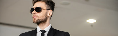 professional headshots, bodyguard service, handsome man in sunglasses and black suit with tie, hotel safety, security management, surveillance and vigilance, uniformed guard on duty, banner