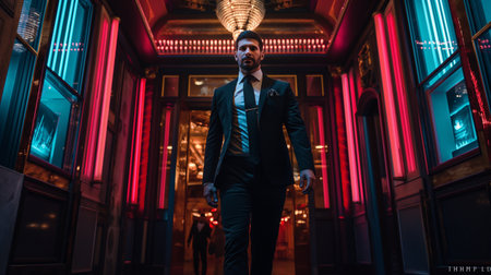 A portrait of a handsome mature man in a formal costume posing in the classic interior in red light. Men's beauty, fashion.
