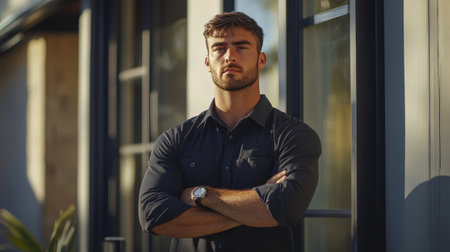 A powerful, minimalist portrait of a confident man with crossed arms His determined expression and calm stance radiate strength and leadership Dressed professionally, he embodies success, ambition, and unwavering focus This image conveys resilience, power, and an unshakeable commitment to achieving his goals AI Generative