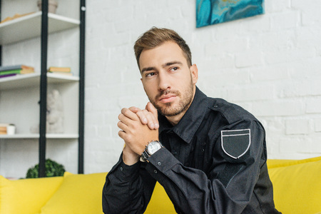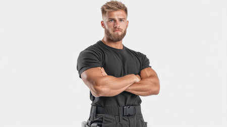 This striking portrait captures a determined male security professional in a tactical vest, exuding confidence and intensity against a dark background.