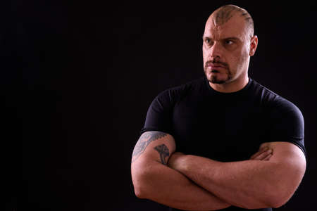 Dramatic portrait of a strong young man in black standing with arms crossed.