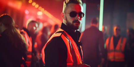 A nightclub security guard ensures the safety and order among revelers. Concept Event Security, Crowd Control, Risk Management, Personal Safety, Emergency Response