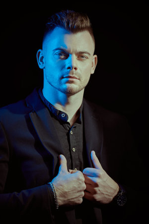 A studio portrait of a handsome brutal man in the mixed colored light. Black background. Psychological art portrait.