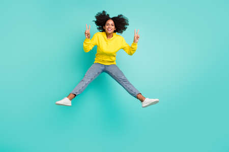 Full length body size view of nice funky cheerful girl jumping showing v-sign isolated over bright teal turquoise color background