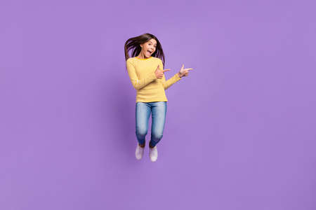 Full length body size view of attractive fit trendy girl jumping having fun action isolated on bright violet purple color background
