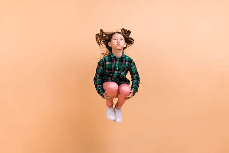 Photo of pretty funky school girl dressed checkered clothes jumping high diving bloated cheeks isolated beige color background