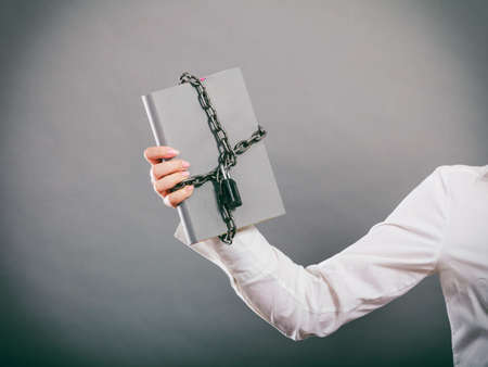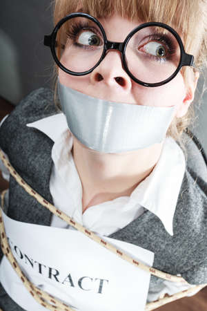 Afraid businesswoman bound by contract terms and conditions with mouth taped shut. Scared woman tied to chair become slave. Business and law concept.