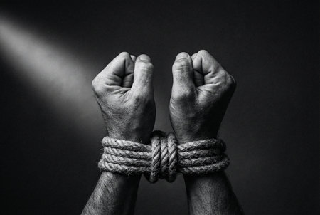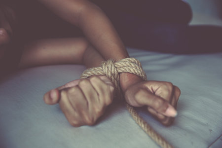 hands tied with a rope on a black background, the concept of stealing people, right day