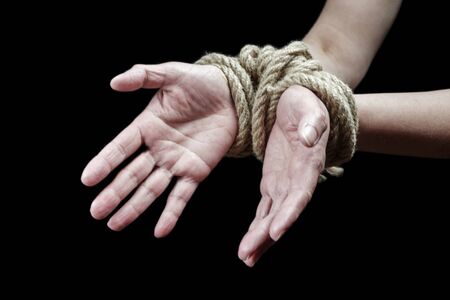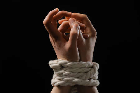 Hands of a victim woman tied up with rough rope on the black background. Stop abusing violence concept