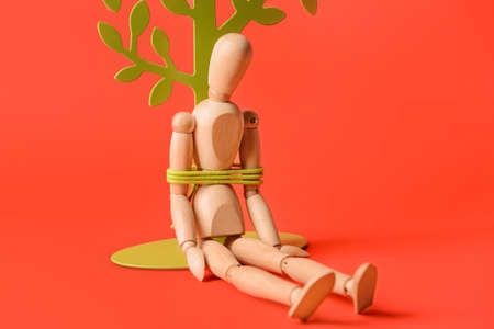 Mannequin with tied around rope near tree on color background. Concept of hostage