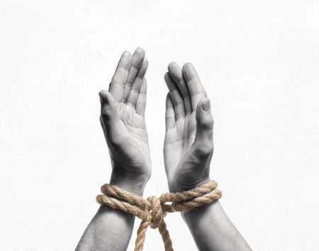 Woman hands tied together with a rope. Trafficking in persons, slavery, domestic violence. Concept