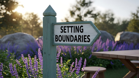 A garden signpost with a Setting Boundaries sign near a picnic table and purple flowers at sunset.