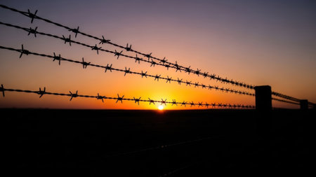 The sun dips below the horizon, casting a warm glow through the sharp points of a barbed wire fence in silhouette
