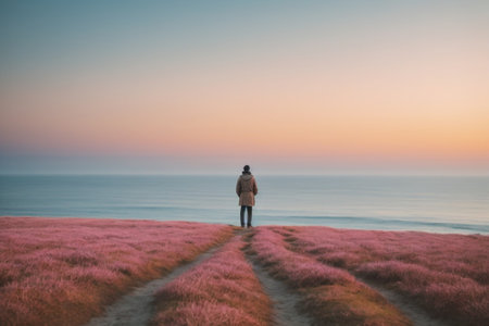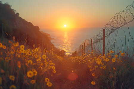 Breathtaking seaside sunset with the sun setting over the horizon, casting a warm glow over the ocean. the scene is framed by vibrant wildflowers and a fence running along the cliff, capturing a peaceful and serene atmosphere. Generative AI