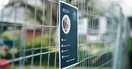 Adoption, fence and poster of rescue dog outdoor for animal shelter, community or pet ownership. Charity, cage and sign with information on enclosure at pound for activism, attention or welfare