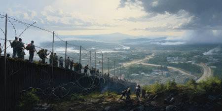 Shadows of migrants behind barbed wire at a border crossing, representing the challenges people confront and the human effort to achieve a better life.
