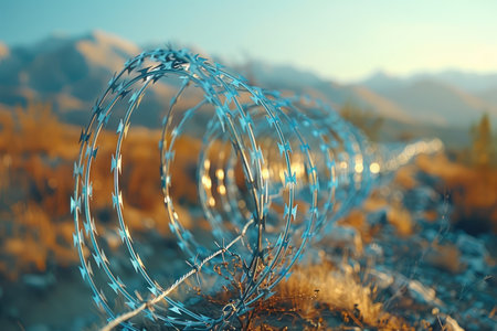 Barbed wire fence is creating a secure border line to stop illegal immigration or protect an area