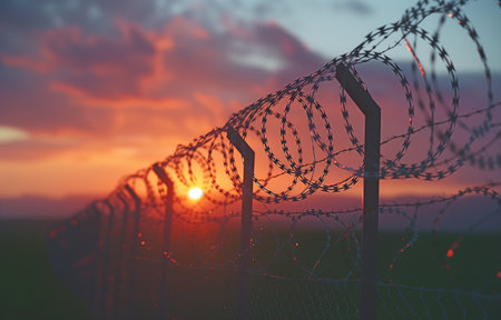 Barbed wire coils lie on the ground in a barren landscape during sunset, with dark clouds creating a somber atmosphere in the background.
