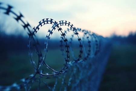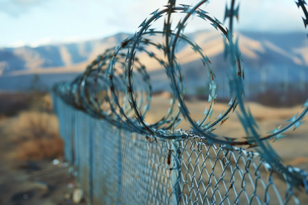 With blurry barbed wire rod fence. Created with Generative AI technology