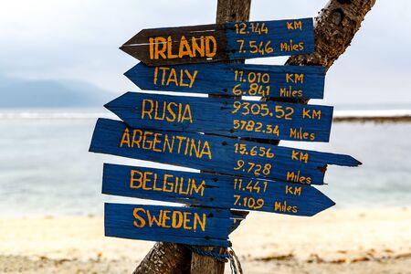 Signpost with countries, blue sky in the background. Yellow boards showing the directions.