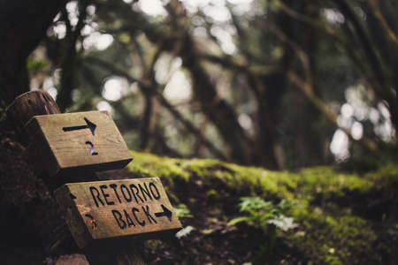 Way back signpost on path in Anaga forest nature reserve in Tenerife.